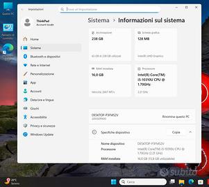 Lenovo ThinkPad T14 i5-10310U 16 RAM 256 SSD Business Laptop 14" Leggeri segni di usura. Ottime condizioni. Pulito e testato. Windows 11 PRO + Office 2024 PRO Intel® Core™ i5-10310U 4 Core 8 Thread (1.7 GHz Turbo 4.4 GHz 6 MB Cache) RAM 16 GB LPDDR4 + slot libero SSD 256 Gb M.2 PCIe® 3.0x4 Display 14" IPS FHD (1920 x 1080) Matte Grafica Intel® UHD Graphics 2x USB 3.2 Type-A, 2x USB 3.2 Type-C Thunderbolt LAN, HDMI, Audio Jack, SD Cardreader Bluetooth® 5.1, Wi-Fi® (802.11a/b/g/n/ac) Dual band Fingerprint, HD Webcam 720p, Digital Microphone Battery Li-Ion 3-cell, 84% salute, circa 4 ore Completo alimentatore Per maggiori informazioni contattami Spedizione con tracciabilita tramite TuttoSubito