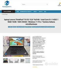 Lenovo ThinkPad T15 G2 Ricondizionato Grado A, notebook di fascia Business ( professionale ) affidabile e performante con Intel i5-1145G7 di 11ª generazione, 16GB RAM e SSD da 256GB per velocità e multitasking senza rallentamenti. Dotato di tastiera italiana retroilluminata, è ideale per lavoro, smart working, ufficio; Qualità professionale eccelso per casa, scuola. Dispositivo testato e garantito, in eccellenti condizioni estetiche e funzionali. Incluso nel prezzo garanzia professionale OnSite ( a domicilio ) per 24 Mesi ! Sistema Operativo Windows 11 Pro già installato pronto all’uso IVA 22% detraibile ( fattura elettronica ) , disponibile anche per Bonus Carta Del Docente e Dote Scuola. Display 15.6" Full HD 1920 x 1080 Antiriflesso IPS Tastiera Italiana Originale retroilluminata Estesa Anno di produzione 2022 Processore Intel Core i5-1145G7 up to 4.40GHz, with IPU RAM Installata16GB ( 2×8 ) DDR4-3200 RAM MAX64GB Hard Disk SSD NVMe M.2 256GB professionale Scheda Grafica Integrata Intel Iris Xe Graphics Sistema Operativo Windows 11 Pro ( licenza originale Microsoft ) Software Installati Sistema Operativo, Driver certificati, BIOS aggiornato, software di base Webcam HD 720p con chiusura privacy Sistema di altoparlanti Dolby Audio, Microfoni a lunga distanza a due canali USB Type-c 2x USB-C (1 Thunderbolt 3) 2 x USB 3.1 di prima generazione (1 sempre attiva) Wi-Fi 6 802.11 AX Bluetooth 5.2 Ethernet LAN RJ-45 HDMI 1.4 Lettore Schede Lettore schede microSD Jack Audio Jack combinato cuffie/microfono Batteria Perfetta 57Wh con supporto per RapidCharge Carica Batterie Originale alimentazione CA da 65W con supporto per RapidCharge Lettore di impronte digitali touch Match on Chip Dimensioni (A x L x P) 1,91cm x 36,6cm x 24,8cm Peso 1,75kg Disponibile anche sul nostro sito con spedizione gratuita ( vedi ultima foto )