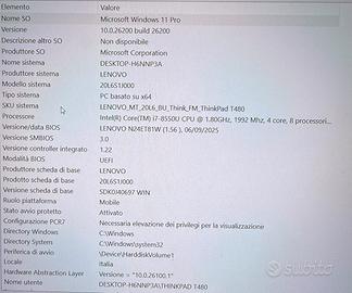 ECCELLENTE E PROFESSIONALE LENOVO THINKPAD T480 CON SCHERMO 14”POLLICI FULL HD IPS RISOLUZIONE 1920X1080.PROCESSORE INTEL QUAD CORE I7-8550U DI OTTAVA GENERAZIONE BIOS ULTIMA VERSIONE-SSD256GB NVME-16GB RAM DDR4-SCHEDA VIDEO INTEL UHD 620.DOTATO DI WEBCAM INTEGRATA-WIFI-BLUETOOTH-USB 3.0/3.1-ISB TYPE-C THUNDERBOLT-2 BATTERIE DI CUI 1 INTERNA E 1 ESTERNA OTTIME(COME DA REPORT DI STATO IN FOTO)-ALIMENTATORE ORIGINALE.INSTALLATO WINDOWS 11 PRO 25H2 LICENZIATO CON TUTTI I PROGRAMMI COMPRESA LA SUITE DI OFFICE 2024 PRO PLUS ATTIVATA!IPERVELOCE E PERFORMANTE IN CONDIZIONI SUPERLATIVE CON MANUTENZIONE COMPLETA EFFETTUATA POCHISSIMA USURA.MACCHINA MOLTO BELLA.