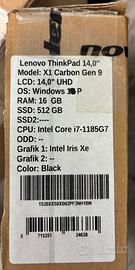 Lenovo Thinkpad X1 carbon 14", i7-1185G7, 16GB Ram, 512GB SSD Perfetto sotto tutti gli aspetti, estetica, display, funzionamento. Usato ma come nuovo, ancora quasi 500 giorni di garanzia.