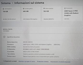 Processore AMD Ryzen™ 3 5350G (da 4.00 GHz fino a 4,9 GHz) Windows 11 PRO 64 Scheda grafica integrata 16 GB DDR4-5.200MHz (UDIMM) 256 GB SSD M.2 2280 PCIe Gen4 TLC Opal HD DA 500 GB. COME ARCHIVIO. 4 PORTE USB e 1 TIPO C anteriori Attacco cuffie e microfono. 4 PORTE USB + 2 uscite video dislayport e 1 HDMI SCHEDA DI RETE. POSTERIORI.  OFFICE 2016 CON LICENZA. NO PERDITEMPO O AFFARISTI. GRAZIE.