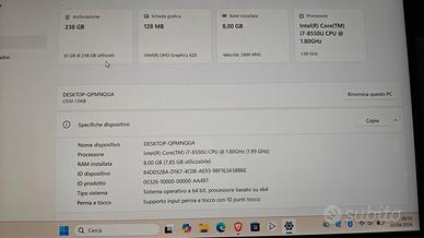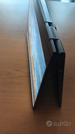 Vendo Lenovo Yoga 2in1 C930-13IKB "glass edition" Versione top, rarissima, con coperchio in vetro e grafica Lenovo molto elegante Uscito nel mercato nel 2019 veniva venduto a 2.000 Euro schermo touchscreen 2in1 (schermo ruota di 360 gradi e può essere usato come un tablet). Computer velocissimo, di fascia alta ad un prezzo nettamente più basso del mercato: paragonate lo stesso modello (glass edition), non troverete nulla di così economico. processore i7-8550U ottava generazione, quad core con 8 thread,con frequenza massima 4,0 GHz RAM 8 GB SSD 256 GB NVMe, molto veloce display touchscreen 13,9 pollici Full HD La cerniera a 360 gradi consente l’utilizzo in modalità notebook, tablet, tenda e presentazione, rendendolo estremamente versatile. Soundbar integrata nella cerniera con tecnologia Dolby Atmos (audio superiore alla media dei portatili). Assente la penna digitale (si trova con una spesa tra i 30 e i 50 euro). Batteria nuovissima, sostituita da me pochi giorni fa, autonomia superiore alle 4 ore (costo € 50). 2 porte USB-C con supporto Thunderbolt 3 per ricarica, dati e uscita video 1 porta USB 3.0 Type-A Jack audio combinato cuffie/microfono WiFi dual band e Bluetooth Tastiera retroilluminata, lettore di impronte digitali Webcam integrata con otturatore privacy pennino assente alimentatore originale USB-C Windows 11 aggiornatissimo Scocca in alluminio elegante e resistente. Oggetto di grande effetto visto per il coperchio superiore in vetro. Il computer è perfetto, nessun conflitto, nessuna avaria. Veloce come un missile ed elegante. Schermo senza pixel bruciati o aloni strani. Esteticamente impeccabile eccetto piano poggia polsi leggermente consunto (presenta una tonalità di grigio lievemente più chiara ma non ha graffi). Consegna a mano zona Mestre centro oppure spedizione con tuttosubito (pacco accuratissimo a prova di carro armato).