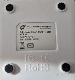 Smart Card Reader per PC. Connessione via USB, adatto alla lettura di tessere dotate di Chip come Codice Fiscale e Tessera Sanitaria. Compatibile con accesso ai siti della Pubblica Amministrazione e uso per CNS (Carta Nazionale dei Servizi). Certificazione RoHS. P/N: ACR38U-I1, marca VisPro. Modello ACR38