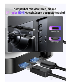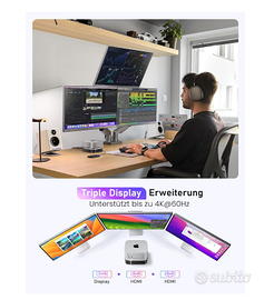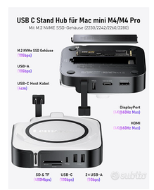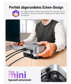 Progettato specificamente per i più recenti Mac Mini M4 e M4 Pro con un layout dell'interfaccia preciso. Questa docking station plug-and-play non richiede driver e funge da supporto stabile, mantenendo il tuo spazio di lavoro organizzato e preservando l'estetica elegante e minimalista del Mac. Dotato di HDMI 2.0 e DisplayPort 1.4, questo hub supporta due monitor esterni 4K a 60 Hz in modalità mirror o estesa. In combinazione con le porte native del Mac Mini, è possibile gestire una configurazione a triplo display per massimizzare la produttività nell'editing video e nel multitasking. Lo slot M.2 integrato nella parte inferiore supporta SSD NVMe/PCIe (dimensioni 2230/2242/2260/2280) con velocità di trasferimento dati fino a 10 Gbps. Una soluzione conveniente per espandere lo spazio di archiviazione fino a 8 TB, consentendo backup locali ad Dispone di USB-C 3.2 da 10 Gbps e USB-A 3.2 da 10 Gbps per una sincronizzazione rapida dei dati, oltre a due porte USB-A 3.0 (5 Gbps) per periferiche come mouse e tastiere. Questa gamma completa garantisce che tutti i tuoi strumenti professionali rimangano connessi senza bisogno di adattatori aggiuntivi.alta capacità e un accesso senza interruzioni a grandi librerie multimediali. lemorele