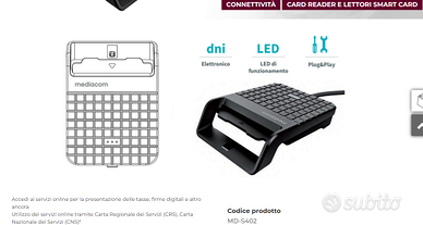 LETTORE MEDIACOM MOD. MD-S402 PER TESSERA SANITARIA ED ALTRE SMART CARD (NO CARTA IDENTITA' ELETTRONICA), NUOVO, MAI USATO, ANCORA IN CONFEZIONE SIGILLATA. ACQUISTATO IL 12/9/2023 (VEDI SCONTRINO) AD EURO 17,99. 2 ANNI DI GARANZIA. VENDO AD EURO 13 MONFALCONE. CELL. 3477708527 WHATS APP 3405976384. POSSO SPEDIRE CON SUPPLEMENTO EURO 12.