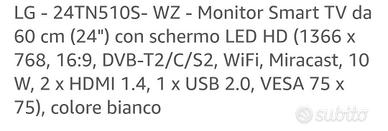LG - 24TN510S- WZ - Monitor Smart TV da 60 cm (24") con schermo LED HD (1366 x 768, 16:9, DVB-T2/C/S2, WiFi, Miracast, 10 W, 2 x HDMI 1.4, 1 x USB 2.0, VESA 75 x 75), colore bianco, classe energetica A.