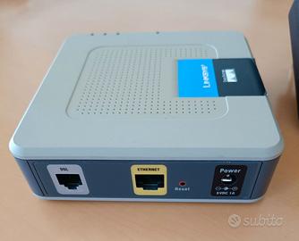 Vendo modem ethernet Linksys AM200 dotato di 1 porta DSL e 1 porta LAN, conforme allo standard ADSL2+ per navigare in internet alla velocità di 24Mb in download e fino a 1Mb in upload.