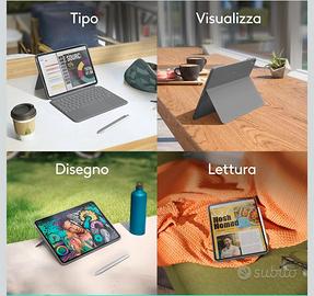 Cover e Tastiera Logitech Combo Touch per iPad Air da 11 pollici (M2, M3 e M4), iPad Air (5a generazione). Inclusa la scatola di acquisto. Custodia con tastiera - Tastiera retroilluminata staccabile con supporto - Layout Italiano QWERTY - Grigio. Qualche segno di usura esterno. Comprato il 22 marzo 2025, in garanzia ancora. Compatibilità: iPad Air da 11 pollici (M2, M3 e M4), iPad Air (5a generazione) - A2902, A2903, A2904, A3266, A3267, A3270, A2588, A2589, A2591 Modalità personalizzabili: molteplici modalità di utilizzo e infinite possibilità; digita, disegna, guarda video, leggi o partecipa a una videochiamata senza rimuovere l’iPad Pro dalla custodia con tastiera. Supporto flessibile, tastiera rimovibile: trova l'angolazione perfetta per il lavoro con il supporto ultraflessibile; stacca la tastiera per disegnare, guardare video o leggere in totale libertà Ampio trackpad multi-touch: il trackpad più grande di sempre, che offre un'esperienza di tracciamento intuitiva; i familiari controlli con gestualità multi-touch ti consentono di scorrere, avvicinare le dita, toccare due volte e altro ancora Protezione completa: la custodia con tastiera robusta e leggera protegge il tuo iPad da urti e graffi, per portarlo ovunque in totale tranquillità Digita giorno e notte: la tastiera retroilluminata wireless regolabile si illumina con eleganza grazie a un'illuminazione precisa, per sessioni di lavoro perfette Smart Connector: la custodia con tastiera Combo Touch per iPad Pro offre una connettività fluida, istantanea e sicura senza bisogno di ricarica: è alimentata dal tuo iPad