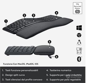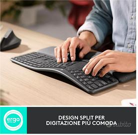 - Logitech ERGO K860 Wireless Split Keyboard - Tastiera Ergonomica Wireless, Poggiapolsi, Connettività Bluetooth e USB, Compatibile con Windows e Mac, Layout Italiano QWERTY - Grigio