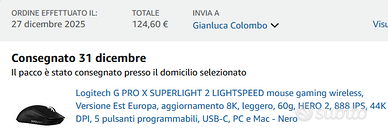 Il mouse è stato acquistato a fine dicembre 2025, quindi ha solo due mesi di vita. È perfettamente funzionante, leggerissimo (60g) e dotato del sensore HERO 2 da 44k DPI.