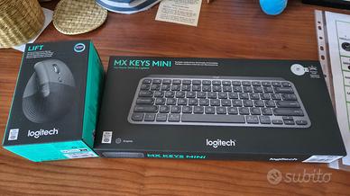 Logitech MX Keys Mini Tastiera Illuminata Wireless, Minimal, Compatta, Bluetooth, Retroilluminata, USB-C, Compatibile con Apple macOS, iOS, Windows, Linux, Android, in Metallo, ITAQWERTY - Grafite e Logitech Lift Mouse Ergonomico Verticale, Senza Fili, Ricevitore Bluetooth o Logi Bolt USB, Clic Silenziosi, 4 Tasti, Compatibile con Windows, macOS, iPadOS, Laptop, PC - Grigio. acquistati su Amazon a luglio 2025 e completi di imballo originale.