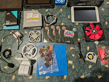 Salve, cedo questo lotto di materiale informatico, proveniente da un magazzino. Ci sono 2 ventole complete, 1 ventola senza cavo, Una striscia led completa 2 strisce led senza cavo, 2 adattatori per prese universali, marca karma, Un altro adattatore per prese universale Un tablet, Un microfono, Due scatoli di pellicole per apple watch, Una striscia led senza cavo ma con dei giunti, Un lettore schede, Dei lego a caso, Ventola e lettori dvd per pc, Vari cd audio, Ricambi Nintendo switch. 1 tablet vecchio che si accende, resettato, smarrpad 815i, 1 tablet che ha schermo rotto, e scatola. Una vecchia console che si accende e funziona, ha qualche graffio. Il tutto si cede come non funzionante, in quanto non testato, tranne per gli adattatori universali che funzionano e le altre cose menzionate testate. Spero di aver elencato tutto Qualsiasi domanda sono a disposizione