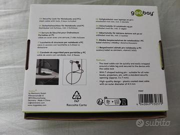Lucchetto di sicurezza professionale Goobay per Notebook, PC e monitor, nuovo di zecca mai usato. Cavo in acciaio ultra resistente lungo 1.5 metri con rivestimento protettivo. Include doppia chiave e aggancio standard a T (3x7mm). Ideale per proteggere i tuoi dispositivi in ufficio, università o luoghi pubblici. Confezione originale inclusa.