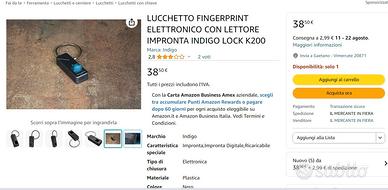 Lucchetto Indigo K200 nuovo configurabile per dieci impronte inclusa quella di amministratore con ricarica usb , venduto si Amazon a 38,50 euro più spese di spedizione