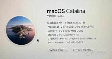 Computer portatile mac book air 11 pollici. Modello mid 2012. Processore intel i7 dual core. 8 gbyte di ram. Perfettamente funzionante. Batteria sostituita un paio di anni fa. Usato in maniera saltuaria. Perfettamente funzionante. Condizioni estetiche come da foto. Completo di alimentatore originale. Posso fornire con sistema operativo più recente rispetto a quello installato. Consegna a mano su Roma o Rieti. Posso spedire. No paypal, no tuttosubito.
