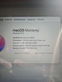 mac book air 13 (2017) Core i5 dual core, 8 G memoria DDR3, 250 Gb perfettamente funzionante, vendo per acquisto nuovo modello. Ritiro a mano in zona metro Cipro a Roma
