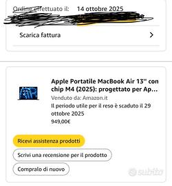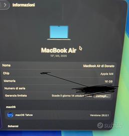 Mac Book Air M4 acquistato a ottobre 2025, utilizzato pochissimo con batteria 100%. Garanzia valida fino a ottobre 2026. In omaggio una borsa per trasportare il portatile.