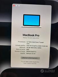 Vendo MacBook Pro Retina 15" Early 2013 model A1398 , perfettamente funzionante e ancora molto performante. Il computer monta processore Intel i7 da 2,7 GHz ed è dotato di 16 GB di RAM DDR3, garantendo ottime prestazioni anche con utilizzo intenso. Il disco di avvio è su SSD, per massima velocità e reattività del sistema. La batteria è stata recentemente sostituita e garantisce circa 6 ore di autonomia anche con utilizzo pesante (applicazioni impegnative, multitasking, ecc.). Attualmente è installato macOS Ventura, così da avere un sistema più aggiornato e moderno, che il Mac gestisce senza problemi. In alternativa, è possibile installare versioni precedenti oppure utilizzare l’ultimo sistema operativo ufficialmente supportato (macOS Big Sur). Dal punto di vista estetico è in ottime condizioni: presenta solo un piccolo segno sulla scocca esterna dello schermo, puramente estetico e che non influisce in alcun modo sul display, che è invece perfetto. Tastiera completamente funzionante con retroilluminazione attiva, touchpad preciso e senza difetti. Memoria interna da 512 GB SSD + inclusa anche una microSD da 256 GB.