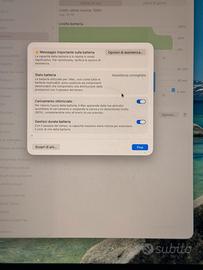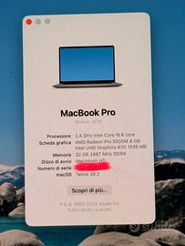Vendo MacBook Pro 16? (fine 2019) o Processore Intel Core i9 8-core @ 2,4 GHz o Scheda grafica AMD Radeon Pro 5500M 8 GB + Intel UHD Graphics 630 o Memoria 32 GB DDR4 2667 MHz o SSD 1tb o Display 16? Retina o Condizioni generali molto buone: o La batteria riporta "Assistenza necessaria": funziona con alimentatore ma richiede sostituzione batteria per perfetta autonomia.la batteria dura circa 3/4 ore senza alimentatore o Il computer viene consegnato con alimentatore originale e o È sempre stato usato per [es: editing video / uso professionale] e trattato con cura. o Solo consegna a mano o spedizione Attenzione , Batteria da valutare sostutuzione e jack per le cuffie non funzionante , ma regalo adattatore usb c a jack originale apple