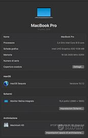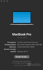 Processore: 2,4 GHz Intel Core i9 8 core Scheda grafica: Intel UHD Graphics 630 1536 MB Memoria: 16 GB 2400 MHz DDR4 MacOS: Sequoia 15.7.2 Come nuovo vendo per non utilizzo. Caricabatteria e scatola comprese
