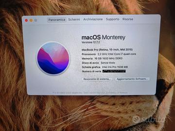 Macbook PRO retina 15"(mid.2015) perfetto, scatola originale. I7 2,2 Ghz, 16gb Ram, SSD 500 Gb, scheda grafica Intel Iris pro. Usato quasi esclusivamente con alimentatore di rete, uso casalingo, la batteria ha solo 48 cicli di ricarica. In ottimo stato. In omaggio magicmouse (valore 75€). Vendo per inutilizzo.