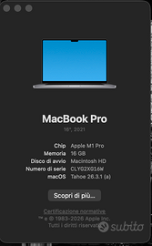 Vendo MacBook M1 Pro 16'' anno 2021 tenuto sempre con scocca superiore e pellicola protettiva (ancora presente) su schermo. Ram 16gb Memoria 512 GB mai in assistenza, mai problemi, vendo per avere un prodotto più recente e più compatto. Batteria 84%. I segni di usura, come si vede dalle foto, sono sulla scocca superiore (purtroppo sono stati fatti mentre facevo le foto per l'annuncio) e su quella inferiore agli angoli. Mai caduto, mai ammaccato, tenuto maniacalmente.
