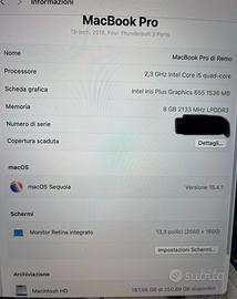 Mac Book Pro con touchbar, ottime condizioni, senza nessun graffio tenuto sempre la cover trasparente. Vendo x acqistare uno con monitor un po' più grande.