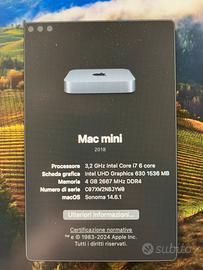 Vendo Mac Mini 2018 in condizioni pari al nuovo, perfettamente funzionante e aggiornato all’ultima versione di macOS Sonoma. Specifiche: Processore: Intel Core i7 6-core 3.2 GHz Grafica: Intel UHD Graphics 630 RAM: 4 GB DDR4 (espandibile fino a 64 GB) Archiviazione: SSD 256 GB Sistema operativo: macOS Sonoma Condizioni: Il Mac è perfetto, sempre usato con cura in ambiente domestico. Nota importante: La RAM è facilmente aggiornabile, quindi può diventare una macchina molto più performante con una spesa contenuta. Incluso: Mac Mini Cavo di alimentazione