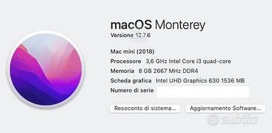 Vendo Mac mini 2018 in configurazione con Intel Core i3 quad-core 3,6 GHz, 8 GB di RAM e SSD da 128 GB. Inizializzato e pronto alla configurazione con macOS Monterey 12. Condizioni: Il Mac presenta evidenti ammaccature estetiche causate da un episodio di trasporto incauto. Questo non ha inciso assolutamente su funzionalità e prestazioni che restano perfette. Però a causa di questi difetti estetici ho già abbassato il prezzo. NB. Questa versione di Mac mini aveva 4 porte Thunderbolt 3 / USB-C comodissime che poi hanno ridotto a 2 nelle versioni successive. Caratteristiche principali: Mac mini 2018 Processore Intel Core i3 quad-core 3,6 GHz 8 GB DDR4 2667 MHz SSD 128 GB Intel UHD Graphics 630 4 porte Thunderbolt 3 / USB-C 2 porte USB-A HDMI 2.0 Porta Ethernet Gigabit Jack cuffie da 3,5 mm Wi-Fi 802.11ac e Bluetooth 5.0 Dotazione inclusa: - Mac mini - cavo di alimentazione - non è presente la scatola originale Nota importante: Le ammaccature sono estetiche e il prezzo tiene già conto di questo difetto. Consegna: Ritiro a mano a Rimini o spedizione con servizio TuttoSubito
