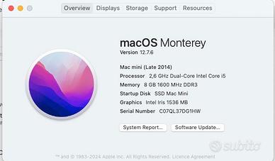 Vendo Mac Mini fine 201 8: 8 Gb di Ram DDR3 2,6 GHz Dual Core Intel Core i5 Fatto upgrade a SSD da 500 Gb OS Monterey Vendo per cambio macchina.