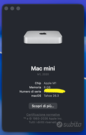 Vendo per passaggio a uno superiore MAC MINI M1 2020 con 256 gb di HDD e 8 Gb di RAM perfettamente funzionante con l'ultimo aggiornamento TAHOE 26.3 , con scatola originale e cavo di alimentazione.