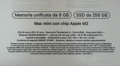 Vendo Mac Mini M2 del 2023 (configurazione 256GB SSD e 8GB RAM), in ottimo stato e perfettamente funzionante.