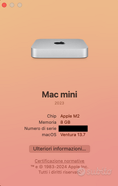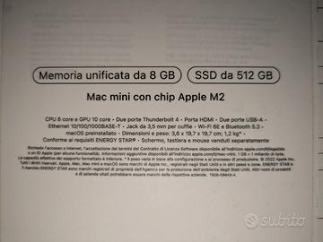 Vendo Mac Mini con chip M2, in condizioni estetiche e funzionali impeccabili. Vendo esclusivamente per passaggio a modello superiore. Specifiche Tecniche: Chip: Apple M2 Memoria RAM: 8 GB Archiviazione: 512 GB SSD (molto più veloce della versione da 256GB grazie al doppio chip NAND) Porte: 2x Thunderbolt 4, 2x USB-A, HDMI, Gigabit Ethernet, Jack cuffie Perfettamente funzionante, tenuto sempre sulla scrivania in ambiente non fumatori Ideale per produzione musicale, video editing 4K e smart working Inclusa scatola originale e cavo di alimentazione originale Software: Attualmente configurato con macOS Ventura, ma pronto per l'aggiornamento all'ultima versione macOS Tahoe Spedizione rapida tramite TuttoSubito (gestita interamente dalla piattaforma per la massima sicurezza). Il pacco verrà preparato con imballaggio protettivo e spedito nei primi giorni lavorativi successivi all'acquisto. Non effettuo ritiro a mano