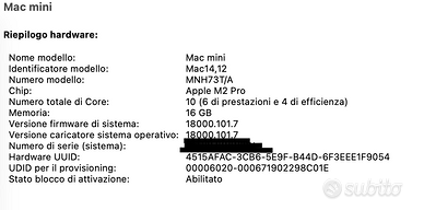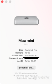 Mac mini M2Pro 2023 - 512 SSD - 16GB memoria. Perfettamente funzionante, completo di scatola originale. No graffi o segni d'usura. Acquistato presso store on-line Apple, ottobre 2023.