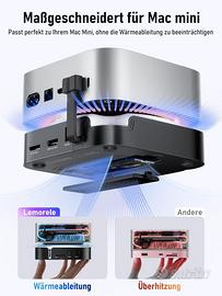 Mac mini M4 Dock con DisplayPort 4K@60Hz per configurazioni a doppio monitor, 4 porte USB 3.2/3.0, slot SSD M.2 NVMe a 10Gbps, lettore di schede SD/TF con Mac mini M4/M4 Pro 【Su misura per Mac Mini M4 e M4 Pro (2024)】Progettato specificamente per i più recenti Mac Mini M4 e M4 Pro con un layout dell'interfaccia preciso. Questa docking station plug-and-play non richiede driver e funge da supporto stabile, mantenendo il tuo spazio di lavoro organizzato e preservando l'estetica elegante e minimalista del Mac. 【Doppia risoluzione Ultra HD 4K a 60 Hz】Dotato di HDMI 2.0 e DisplayPort 1.4, questo hub supporta due monitor esterni 4K a 60 Hz in modalità mirror o estesa. In combinazione con le porte native del Mac Mini, è possibile gestire una configurazione a triplo display per massimizzare la produttività nell'editing video e nel multitasking. 【Slot SSD NVMe M.2 ad alta velocità da 10 Gbps】 Lo slot M.2 integrato nella parte inferiore supporta SSD NVMe/PCIe (dimensioni 2230/2242/2260/2280) con velocità di trasferimento dati fino a 10 Gbps. Una soluzione conveniente per espandere lo spazio di archiviazione fino a 8 TB, consentendo backup locali ad alta capacità e un accesso senza interruzioni a grandi librerie multimediali. 【Connettività versatile da 10 Gbps e 5 Gbps】Dispone di USB-C 3.2 da 10 Gbps e USB-A 3.2 da 10 Gbps per una sincronizzazione rapida dei dati, oltre a due porte USB-A 3.0 (5 Gbps) per periferiche come mouse e tastiere. Questa gamma completa garantisce che tutti i tuoi strumenti professionali rimangano connessi senza bisogno di adattatori aggiuntivi. 【SD/TF 3.0 di livello professionale e stabilità affidabile】I lettori di schede SD 3.0 e TF 3.0 integrati consentono a fotografi e designer di importare istantaneamente file ad alta risoluzione. Realizzato con materiali resistenti e ottimizzato per la dissipazione del calore, questo dock garantisce connessioni stabili e protegge l'hardware durante i carichi di lavoro intensivi.
