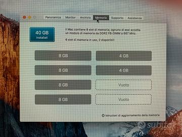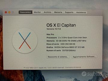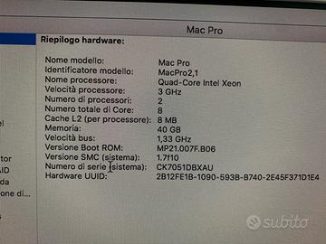 Come da titolo, vendo MacPro 2.1 8 core, RAM 40 GB, scheda grafica Nvidia GeForce 8800 GT da 512 MB disco rotazionale da 250 GB tutto perfettamente funzionante, il case esternamente presenta dei segni di usura, internamente è tutto perfetto, disponibile a qualsiasi prova presso Ufficio previo appuntamento.