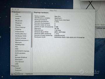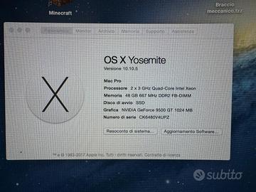 Mac Pro Processore 2 x 3 GHz Quad-Core Intel Xeon Memoria 48 GB 667 MHz DDR2 FB-DIMM Disco di avvio SSD Grafica NVIDIA GeForce 9500 GT 1024 MB Numero di serie CK6480V4UPZ