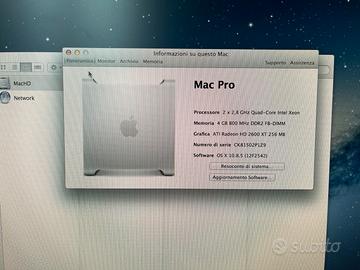 Mac Pro 2009 funzionante in ottime condizioni estetiche. Equipaggiato con HD da 2TB e 4GB ram e doppio processore Intel Xeon. N. B. : Non funziona masterizzatore interno. Viene fornito senza tastiera e senza mouse.