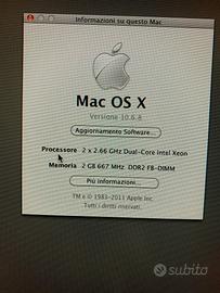 disco rigido da 320 GB, SuperDrive, scheda grafica Nvidia GeForce 7300GT con 256 MB di VRAM. 2 gb di RAM espandibile a 16 gb (8 slot RAM), 4 slot per HD da 3,5 pollici.