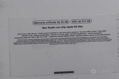 Mac Studio con chip Apple M2 Max Memoria 32GB SSD 512 Vendo per inutilizzo