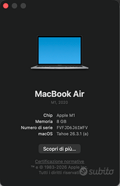 ✅Macbook air FUNZIONANTE ✅Nessun difetto estetico, né sulla scocca né sulla tastiera. Usato sempre con cover. Ancora valido per usi universitari, ufficio e piccoli lavori di editing. 🔋91% - Confezione e caricabatterie inclusi. Vendo per passaggio a modello successivo. 👉🏽Prezzo leggermente trattabile dopo aver visionato l'oggetto ❌NO offerte ridicole