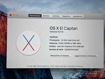 Vendo MacBook 12 pollici Retina anno 2016, processore Intel Core m5 1.2 GHz, 8GB RAM.