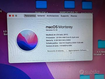 Vendo MacBook Air 13" 2017 - 128GB - 8GB Ram Completo di scatola originale. Batteria da sostituire - ormai esaurita e con pochi minuti di autonomia (vedere foto). Per il resto funziona perfettamente. Ritiro in zona Roma Sud