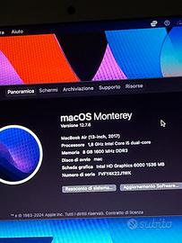 Vendo MacBook Air 13” (2017) funzionante, con difetto estetico sulla scocca. Caratteristiche: •Processore: Intel Core i5 1.8 GHz •RAM: 8GB •SSD: 128GB •Grafica: Intel HD Graphics 6000 •Display: 13” •Sistema: macOS Monterey Normali segni di utilizzo •Batteria in condizioni normali