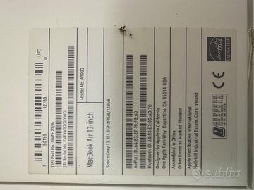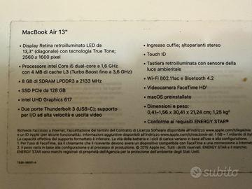 Mac book air 2019 schermo 13,3 Retina display processore i5 8gb Ram SSD 128GB (caratteristiche come da etichetta). completa di imballo originale. funziona perfettamente e la batteria ha ancora un ottima capacità. Mac OS Sonoma