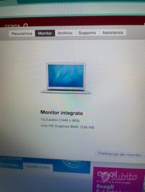 Macbook Air, schermo 13.3 perfetto e tutti i pixel sani, leggera ammaccatura su di un angolo della scocca. Processore Intel Core I5 1600, 120GB SSD, ram 4 GB DDR, scheda grafica INTEL 6000.