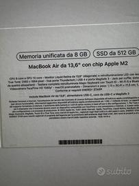 Vendo MacBook Air 13,6” con chip Apple M2, acquistato e utilizzato soltanto 2 volte, quindi pari al nuovo.