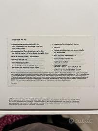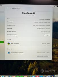 Vendo MacBook Air 13” - anno 2019. Perfettamente funzionante, senza nessun problema di software e nessun difetto estetico. Come nuovo. Incluso il caricabatteria (rapido da 30 w). Specifiche: •Processore Intel Core i5 dual-core 1,6 GHz (Turbo Boost fino a 3,6 GHz) •8 GB di RAM LPDDR3 •SSD da 128 GB •Display Retina 2560x1600 con True Tone •Touch ID •Due porte Thunderbolt 3 (USB-C) •Wi-Fi 802.11ac + Bluetooth 4.2