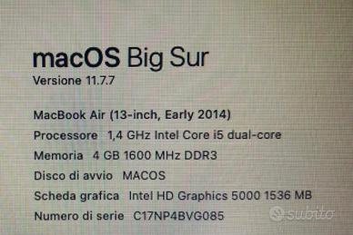 Vendo MacBook Air 13 pollici (Early 2014) funzionante, ideale per uso base (navigazione internet, email, documenti, streaming).