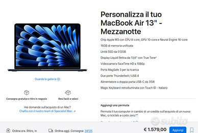 Vendo MacBook Air 13” M3 – 16GB RAM, 512GB SSD colore Midnight – NUOVO, SIGILLATO!